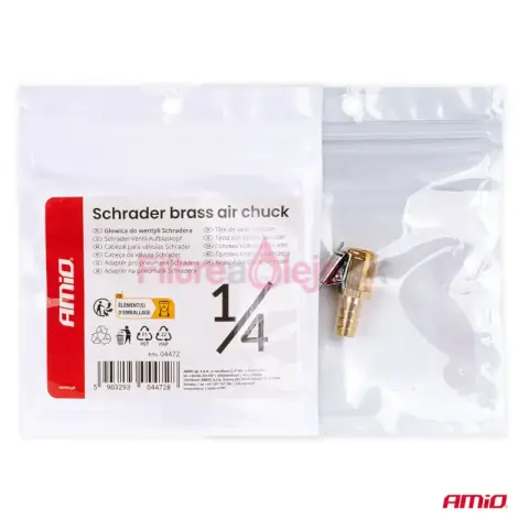 AMIO Adaptér na hustenie pneumatík – Ventily Schrader (AV) je mosadzná hlavica pre rýchle a tesné pripojenie na automobilové ventily Schrader. Odolné mosadzné telo zaručuje dlhú životnosť a spoľahlivú priľnavosť aj pri častom dielenskom použití. Vhodné pre osobné, dodávkové a nákladné vozidlá, motocykle a bicykle so Schrader (AV) ventilom.
