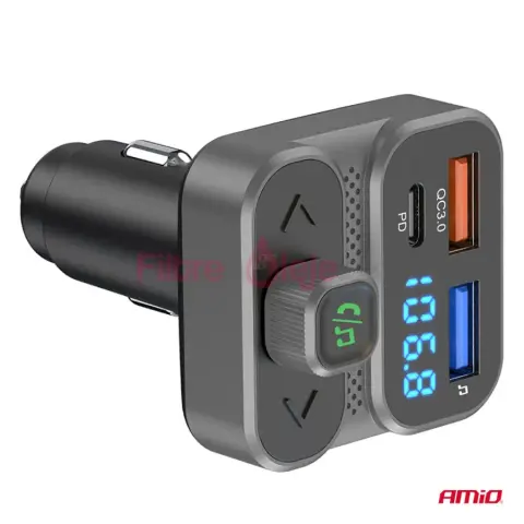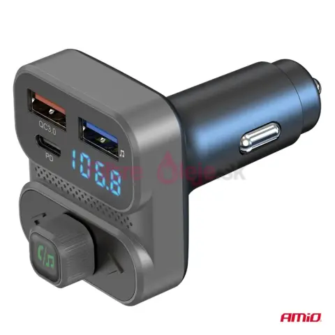 AMIO FM transmitter 2×USB-A 1×USB-C 12 V / 24 V je multifunkčný FM vysielač s modulom Bluetooth, ktorý umožní bezdrôtové prehrávanie hudby a telefonovanie v režime hands-free aj v autách s klasickým rádiom bez Bluetooth. Stačí ho zapojiť do zásuvky zapaľovača, spárovať so smartfónom a zvuk sa prenáša do autorádia cez FM frekvenciu, takže môžeš používať moderné funkcie bez výmeny celého rádia.
