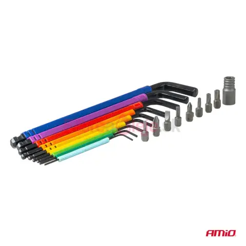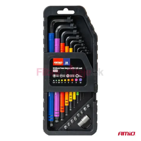 AMIO sada imbusových kľúčov a bitov 18 ks je praktická a odolná výbava do dielne aj na servisné práce. Obsahuje 9 extra dlhých HEX imbusov s guľovou koncovkou a 8 bitov s adaptérom. Náradie je vyrobené z pevnej chróm-vanádiovej ocele (CR-V), ktorá je vhodná na pravidelné používanie a dlhú životnosť. Guľová koncovka umožňuje skrutkovať aj pod uhlom, čo oceníš hlavne v stiesnených a horšie prístupných miestach.