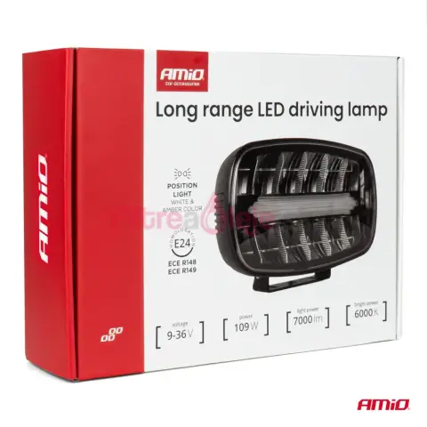 AMIO LED diaľkový reflektor je výkonné a odolné osvetlenie určené pre off-road vozidlá, úžitkové a pracovné stroje; poskytuje výkon 109 W, svetelný tok 7000 lm pri teplote farby 6000 K, pracuje v rozsahu napätia 9–36 V (12 V / 24 V) a je vybavený funkciou pozičných svetiel. Telo reflektora je pevné a odolné (rozmery 245 × 160 × 73 mm), navrhnuté pre prevádzku v náročných podmienkach, a reflektor má príslušné homologácie E24, ECE R148, ECE R149.