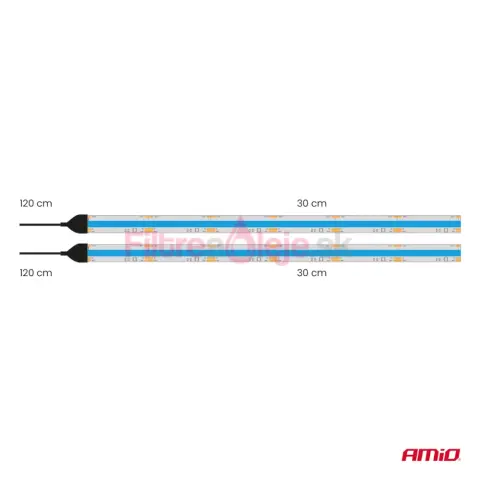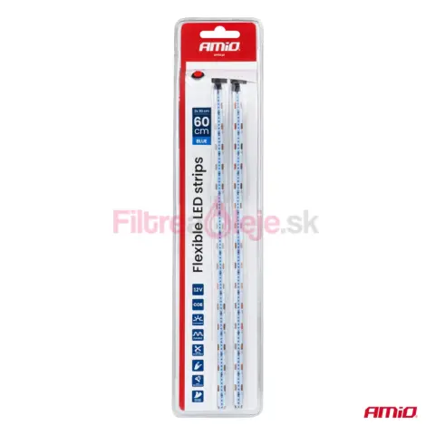 AMIO COB LED pásiky sú flexibilné pásiky vyrobené v technológii COB (Chip On Board), určené pre montáž v automobiloch a iných vozidlách s napájaním 12 V. Sada obsahuje dva pásiky po 30 cm, ktoré emitujú intenzívne modré svetlo s veľmi súvislým a rovnomerným svetelným pásom typickým pre COB. Vďaka pružnej konštrukcii sa pásiky ľahko prispôsobia tvaru montážnej plochy a zabudovaná funkcia „try me“ uľahčuje predajnú prezentáciu.