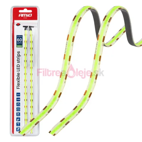 AMIO COB LED pásiky sú flexibilné pásiky s technológiou COB (Chip On Board) určené pre montáž v automobiloch a iných vozidlách s napájaním 12 V. Sada obsahuje dva pásiky po 30 cm, ktoré emitujú intenzívne zelené svetlo s jednotným a súvislým svetelným pásom typickým pre COB. Vďaka flexibilnej konštrukcii sa pásiky ľahko prispôsobia tvaru montážnej plochy a zabudovaná funkcia „try me“ uľahčuje prezentáciu v predajni.