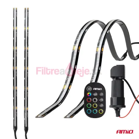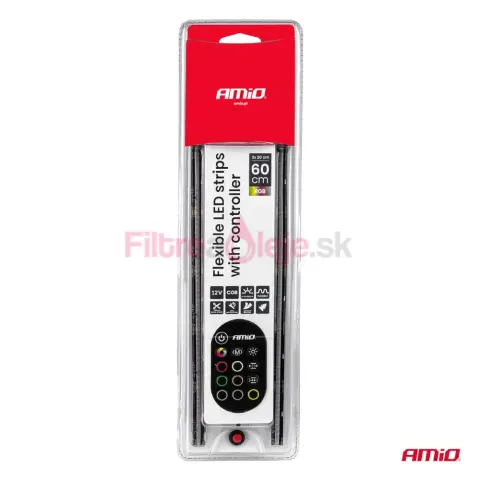 AMIO LED pásiky sú flexibilné RGB (viacfarebné) pásiky určené pre dekoratívne osvetlenie vozidla. Sada obsahuje dva pásiky po 30 cm a sterovač s diaľkovým ovládaním, ktoré umožňuje jednoduchú zmenu farieb a režimov svietenia. Vďaka pružnej konštrukcii sa pásiky ľahko prispôsobia tvaru montážnej plochy a funkcia “try me” uľahčuje prezentáciu v predajni.