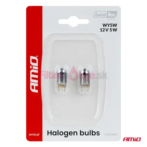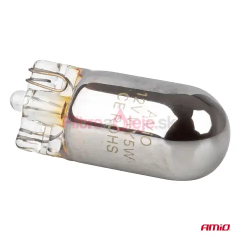 AMIO LUMITEC CHROME – Halogénové žiarovky WY5W 12V 5W (2 ks) sú kvalitnou náhradou štandardných žiaroviek pre pozičné/obrysové svetlá a pomocné osvetlenie. Chromovaná (zrkadlová) povrchová úprava baňky zabezpečí neutrálny, strieborný vzhľad v reflektore – bez efektu „žltej baňky“ – pri zachovaní jasného, rovnomerného svitu.