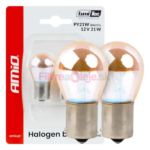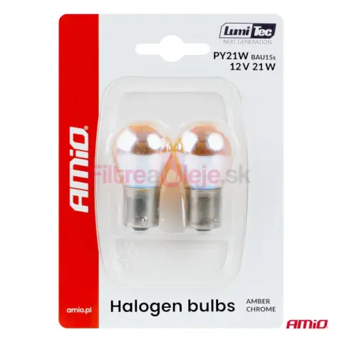 AMiO LUMITEC Halogénové žiarovky PY21W 12V 21W BAU15s AMBER CHROME (2 ks) sú prémiové smerovkové žiarovky s chrómovanou baňkou a intenzívnym jantárovým svetlom. Technológia AMBER CHROME zabezpečí v reflektore elegantný striebristý vzhľad bez „oranžového vajíčka“, no po rozsvietení svietia jasne a výrazne v súlade s ECE.