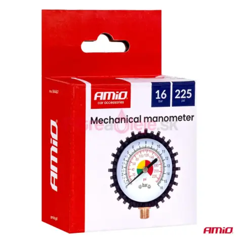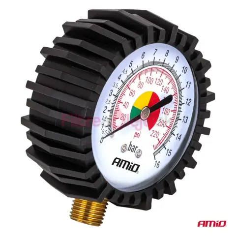 AMIO Manometer 16 bar je spoľahlivý mechanický tlakomer navrhnutý na rýchlu kontrolu tlaku pneumatík bez potreby napájania. Robustné prevedenie s ochranným gumovým púzdrom chráni prístroj pred nárazmi a opotrebovaním, takže sa hodí do dielne aj na terénne použitie.