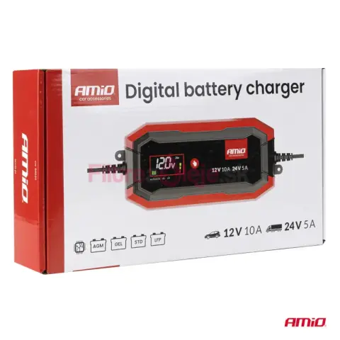 Profesionálna digitálna nabíjačka pre osobné aj úžitkové vozidlá, stroje a poľnohospodársku techniku. Podporuje 12 V aj 24 V systémy, má výstup až 10 A (12 V), udržiavanie napätia (float) a regeneráciu (desulfáciu). IP65 krytie, možnosť priskrutkovania na stenu a rýchlospojka s prídavným káblom s očkami pre trvalé pripojenie.