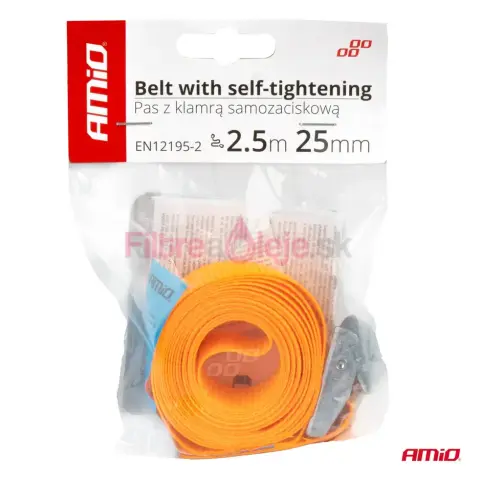 AMIO Pás so samouťahovacou prackou 5m x 25mm je praktický, bezpečný a ľahko použiteľný upínací prvok, ktorý zjednodušuje a zrýchľuje zaistenie nákladu. Vďaka samouťahovacej pracke, odolným materiálom a norme EN 12195-2 je ideálny pre profesionálov i súkromných používateľov, ktorí požadujú spoľahlivé riešenie pre každodennú prepravu.
