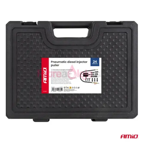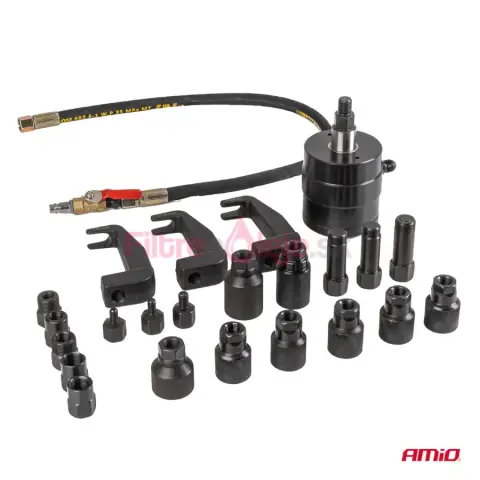 AMIO pneumatický sťahovák vstrekovačov (24 prvkov) je profesionálny set určený na demontáž zadretých/zapečených dieselových vstrekovačov. Využíva pneumatický vysokofrekvenčný úder, ktorý prenáša energiu priamo na vstrekovač, čím výrazne znižuje potrebu fyzickej sily a zároveň pomáha minimalizovať riziko poškodenia hlavy motora pri náročných zásahoch.