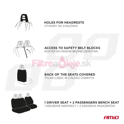 Praktická sada poťahov pre 3 miesta vpredu – samostatné sedadlo vodiča a dvojitú lavicu spolujazdcov. Vyrobené z odolnej textílie so zvýšenou odolnosťou proti oderu, znečisteniu a blednutiu. Konštrukcia je kompatibilná s bočnými airbagmi v sedadlách (SRS), takže neobmedzuje ich aktiváciu. Zadné časti sú plne kryté s otvormi pre opierky hlavy a prístupom k bezpečnostným pásom.