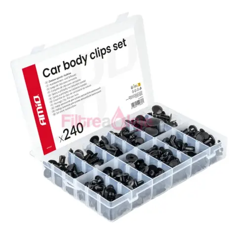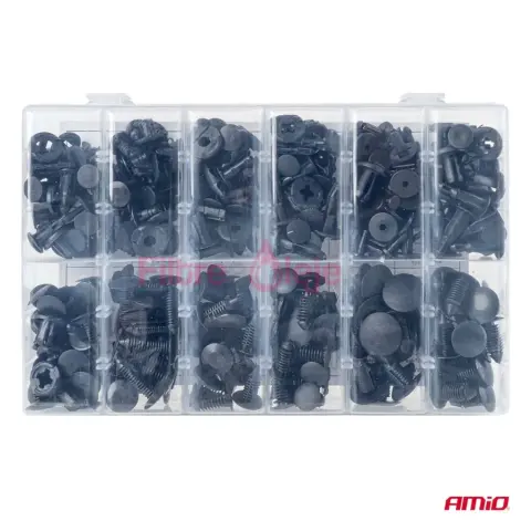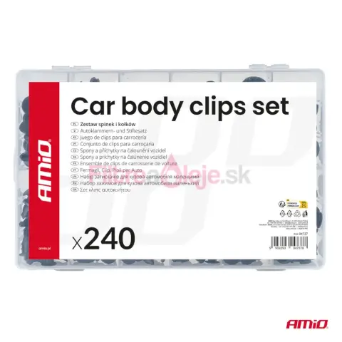 AMIO sada spôn a príchytiek 240 ks je univerzálny set na opravy a montáž plastových dielov v aute. Obsahuje rôzne typy spôn, klipov a montážnych kolíkov, ktoré sa používajú pri upevňovaní čalúnenia, interiérových panelov, líšt a plastových krytov. Vďaka väčšiemu počtu kusov je to ideálna zásoba do dielne, detailingu aj pre pravidelné domáce opravy.