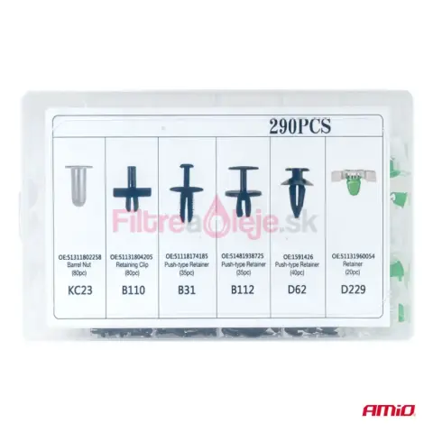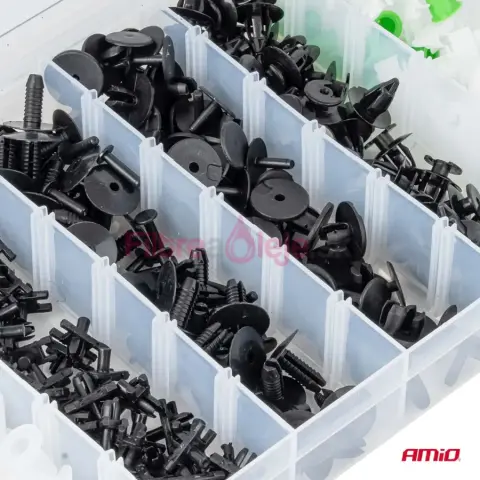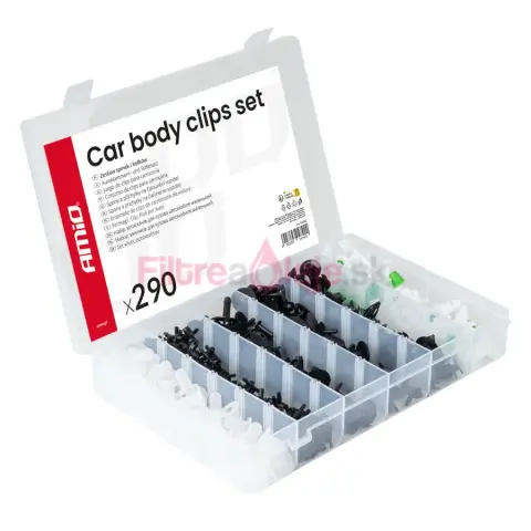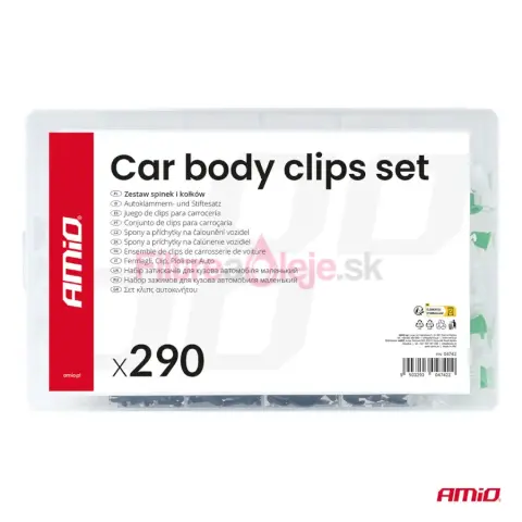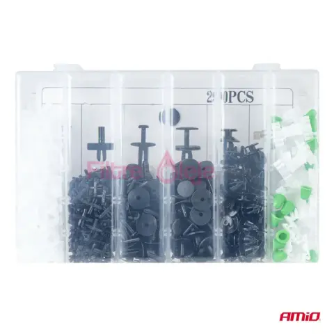 AMIO sada spôn a príchytiek 290 ks je univerzálny set určený na opravy, servis a montáž plastových dielov v aute. Obsahuje rôzne typy spôn, klipov a montážnych kolíkov, ktoré sa používajú pri uchytení čalúnenia, interiérových panelov, líšt, podblatníkov a plastových krytov. Vďaka vyššiemu počtu kusov je výborná ako zásoba do dielne aj pre náročnejších domácich majstrov.