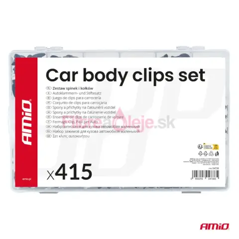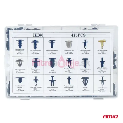AMIO sada spôn a príchytiek 415 ks je veľký univerzálny set určený na opravy, servis a montáž plastových dielov v aute. Obsahuje široký mix spôn, klipov a montážnych kolíkov, ktoré sa používajú pri upevňovaní čalúnenia, panelov, líšt, podblatníkov a rôznych plastových krytov. Vďaka vysokému počtu kusov je ideálna ako dielenská zásoba pre časté demontáže a opravy.