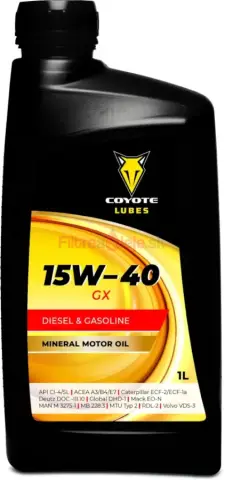 COYOTE LUBES 15W-40 GX je celoročný viacstupňový motorový olej na báze mimoriadne kvalitných základových olejov. V kombinácii s novo vyvinutou kombináciou aditív poskytuje vynikajúce mazacie vlastnosti, vysokú ochranu proti opotrebovaniu a spoľahlivú čistotu motora. Je vhodný pre všetky benzínové a dieselové motory, s preplňovaním aj bez neho, v osobných, úžitkových aj pracovných vozidlách.