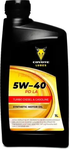 COYOTE LUBES 5W-40 PD LA je plne syntetický celoročný motorový olej na báze moderných syntetických základových olejov so starostlivo zvoleným balíkom špičkových aditív. Je navrhnutý tak, aby spĺňal náročné požiadavky moderných benzínových, naftových a plynových motorov, vrátane motorov so systémami dodatočnej úpravy výfukových plynov (DPF, katalyzátory) a vstrekovaním čerpadlo-tryska (PD). Tepelná stabilita a nižší obsah sulfátového popola zabezpečujú vysokú čistotu piestov a minimum usadenín v turbodúchadle.