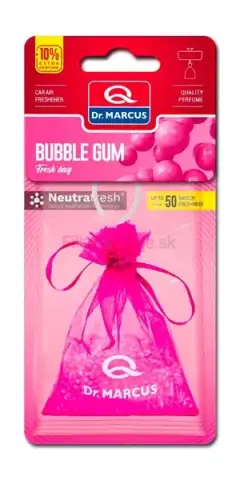 DR. MARCUS FRESH BAG - Vrecúšková vôňa Žuvačka (Bubble Gum) je hravý závesný osviežovač vzduchu vo forme malého textilného vrecúška naplneného polymérovými guličkami. Sladká, typicky „žuvačková“ aróma pripomínajúca detstvo a cukríky skvele oživí interiér auta, šatníka aj kúpeľne a dodá mu sviežu, zábavnú atmosféru.