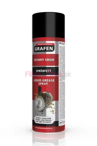 GRAFEN Liquid Grease je aerosolový tekutý mazací tuk, navrhnutý na dlhodobé mazanie a zníženie trenia medzi kovovými dielmi i medzi kovom a plastom. Vďaka vysokej priľnavosti vytvorí odolný film aj na zvislých plochách, nezhoršuje povrchové laky a možno ho aplikovať 360° — ideálny pre rýchle servisné zásahy a údržbu tam, kde klasické tuky ťažko priľnú.