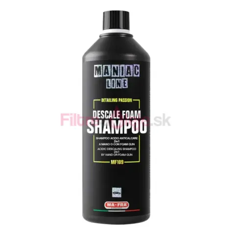 MA-FRA MANIAC LINE DESCALE FOAM SHAMPOO – kyslý penivý šampón 1 l je špecializovaný odvápňovací autošampón 2v1 s kyslým pH, ktorý účinne odstraňuje vodný kameň a minerálne usadeniny, obnovuje lesk laku a plastov, je šetrný k existujúcim ochranným vrstvám a vďaka hustej, vysoko klznej pene s technikou Pillow Foam zabezpečuje maximálne bezpečné, šetrné a zároveň veľmi účinné umývanie aj v náročných podmienkach s tvrdou vodou.