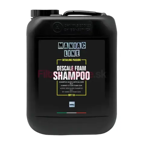 MA-FRA MANIAC LINE DESCALE FOAM SHAMPOO – kyslý penivý šampón 5 l je špecializovaný odvápňovací autošampón 2v1 s kyslým pH, ktorý účinne odstraňuje vodný kameň a minerálne usadeniny, obnovuje lesk laku a plastov, je šetrný k existujúcim ochranným vrstvám a vďaka hustej, vysoko klznej pene s technikou Pillow Foam zabezpečuje maximálne bezpečné, šetrné a zároveň veľmi účinné umývanie aj v náročných podmienkach s tvrdou vodou.