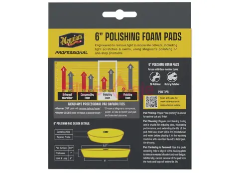 Meguiar’s Professional Polishing Foam Pad sú prémiové penové leštiace kotúče určené na korekciu a leštenie laku s dôrazom na hladký finish. Sú navrhnuté na odstraňovanie ľahkých až stredných defektov ako jemné škrabance, oxidácia, ľahké stopy po kyslom daždi či hologramy. Pokročilá penová technológia Meguiar’s pomáha udržať rovnomerný tlak a stabilný výkon bez vytvárania nových nežiaducich stôp.