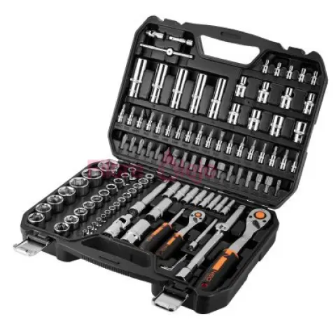 Nástrčkové kľúče ¼", ½", sada 110 kusov, CRV, 10-066 NEO je kvalitná sada až 110 kusov produktov ponúkaná v pohodlnom plastovom kufríku s kovovými západkami a praktickou rukoväťou. Vertikálne umiestnenie prvkov v ňom zaručuje väčší komfort používania a rýchlejší zber potrebného príslušenstva. Sada obsahuje nasledujúce nástroje a príslušenstvo: