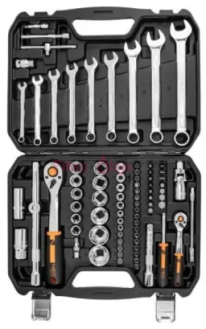Nástrčkové kľúče ½", ¼", sada 82 kusov, ECO, 10-058 NEO je kvalitná sada až 82 kusov produktov ponúkaná v pohodlnom plastovom kufríku s kovovými západkami a praktickou rukoväťou. Vertikálne umiestnenie prvkov v ňom zaručuje väčší komfort používania a rýchlejší zber potrebného príslušenstva. Sada obsahuje nasledujúce nástroje a príslušenstvo: