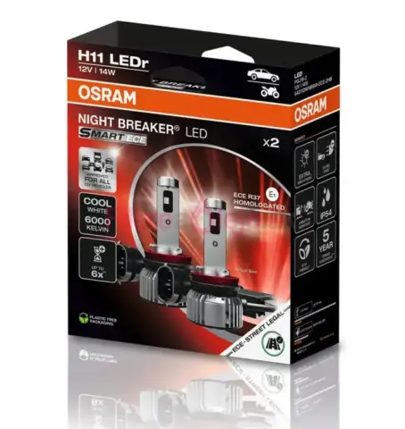 OSRAM NIGHT BREAKER® H11-LED SMART ECE je prvá retrofitná LED žiarovka OSRAM s homologizáciou ECE R37, navrhnutá ako priamy náhradný zdroj svetla pre žiarovky typu H11. Ponúka jasné xenónovo biele svetlo (≈ 6000 K), vysokú účinnosť a konštrukciu odolnú voči vibráciám a vplyvom počasia (IP55). Vďaka homologizácii je vhodná na použitie vo vozidlách registrovaných v krajinách ECE bez dodatočných dokladov alebo úprav svetlometov.