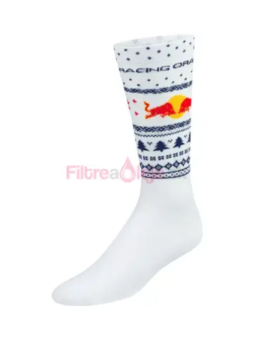 Ponožky Red Bull Ring – Vianočná edícia (biele, UNI veľkosť 39–45) sú štýlové vysoké ponožky s vianočno-zimným motívom a legendárnym logom Red Bullu. Biela základná farba doplnená tmavomodrým nórskym vzorom, stromčekmi a veľkým červeným býkom uprostred robí z týchto ponožiek ideálny doplnok pre fanúšikov motošportu aj sviatočnej atmosféry.