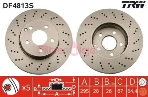 TRW DF4813S je predný, vetraný a perforovaný brzdový kotúč s povrchovou úpravou (lakovaný/-coated), určený ako náhradný diel pre osobné vozidlá (napr. rôzne modely Mercedes-Benz). Kotúč kombinuje dobrú odvodnosť tepla (vďaka ventilácii) s vŕtaným profilom pre lepší výkon pri brzdení.