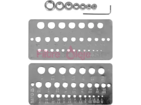 Sada obsahuje dve ovládacie platne a obmedzovače hĺbky vŕtania - sústružené, oceľové s aretačnou skrutkou fi 3/4/5/6/8/10/12 mm a jeden 1,5 mm imbusový kľúč.