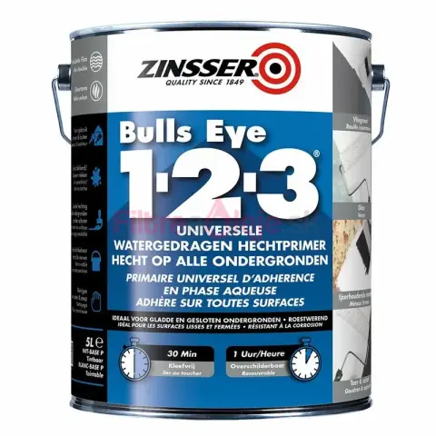 ZINSSER BULLS EYE 1-2-3 – Univerzálny akrylový základný náter, blokátor škvŕn a antikorózna ochrana, 2,5 L je vodou riediteľný akrylový primer/sealer pre interiér aj exteriér. Poskytuje špičkovú priľnavosť bez brúsenia aj na veľmi hladkých podkladoch, blokuje väčšinu bežných škvŕn a zároveň pôsobí ako antikorózny náter na kovy. Odoláva vysokému pH minerálnych podkladov a rýchlo schne – ideálny pre steny, stropy, dvere, obklady, zábradlia či kovové rámy.
